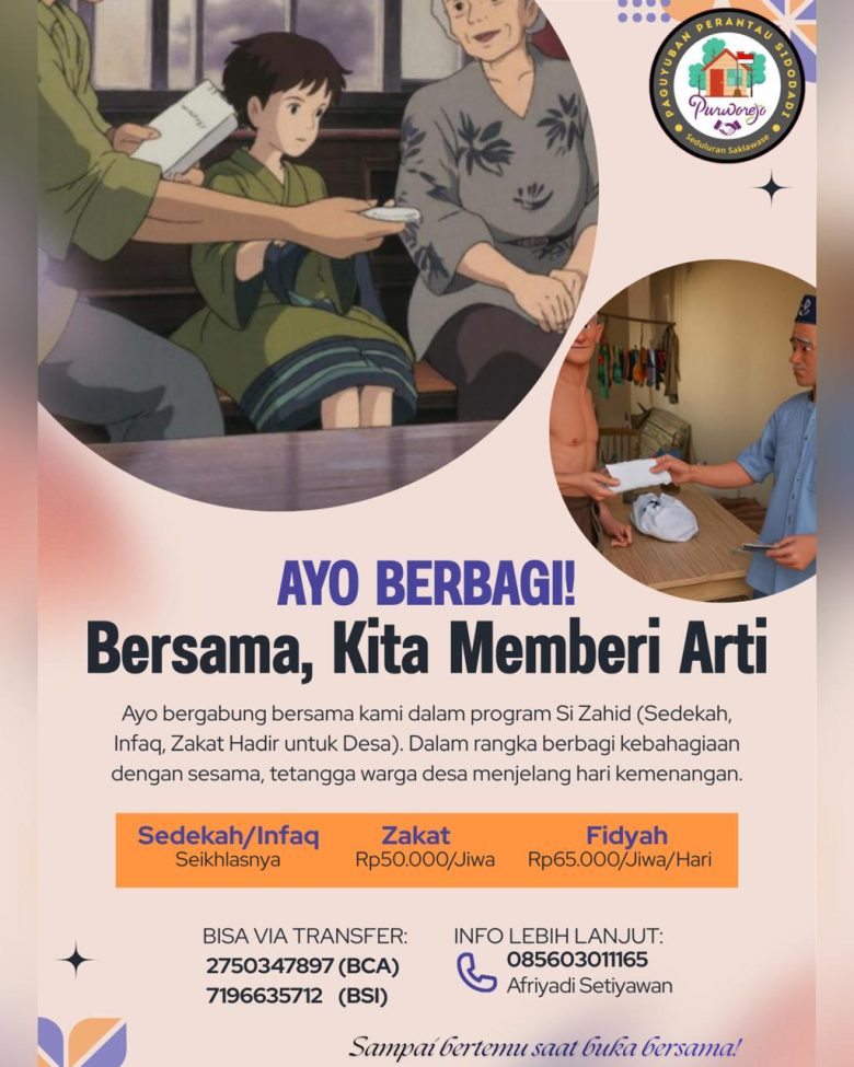 Dalam rangka menyemarakkan bulan penuh berkah serta menumbuhkan kepedulian sosial, Paguyuban Perantau Sidodadi menghadirkan program Si Zahid (Sedekah, Infaq, Zakat Hadir untuk Desa). Program ini menjadi wadah bagi kita semua untuk berbagi kebahagiaan dengan sesama, khususnya masyarakat desa menjelang hari kemenangan.